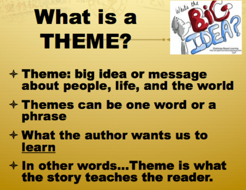 The free slideshow above can help you teach your 3rd grade, 4th grade, or 5th grade students how to determine the theme of a story. Theme is the life lesson, author's message, or moral of a story. Readers are asked to find the theme of two very short . Literature, stories, art, movies etc… the theme can be a moral. What makes a story linger in our hearts and minds long .